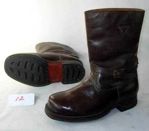 56式冬飞行皮服1954年研制成功装备部队。样式为上衣夹克式,裤子马裤式。上衣配貂毛皮领,前襟装有拉链,四个口袋,上口袋为内装式带拉链,下口袋内装式斜插口,袖口和下围装有松紧布,后背两个活折。裤子腰部有两个内装式带拉链的斜口袋,前开门及裤腿开口处亦装有拉链。用料面为深棕色光面羊皮服装革,里衬草绿色平布,中间絮丝棉。
