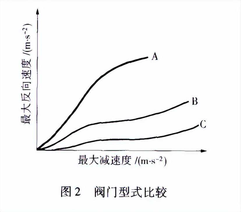 止回阀主要型式分旋启式、双板式和轴流式,三种型式的对比见图2,从曲线看出,旋启式止回阀型式A,在动态工况条件下有较长的响应时问,较高的逆流速度会产生阀门砰击和有害的压力冲击波。双板式止回阀型式其响应时间介于旋启式和轴流式止回阀之间;轴流式止回阀型式C,当管道中介质流速减小时,弹簧弹力克服作用在阀瓣上渐小的流体压力,触发阀瓣瞬时关闭阀门。其结果具有最小的逆流速度,最快的响应时间,因此阀门无冲击,避免了压力冲击及水锤现象的影响。