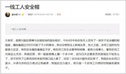 想想也是。脆皮安全帽问题在建筑行业普遍存在,要不然也不会有那么多卖家。窦师傅的曝光影响了多少人的利益和饭碗?哪个老板愿意找这样挑刺的员工?