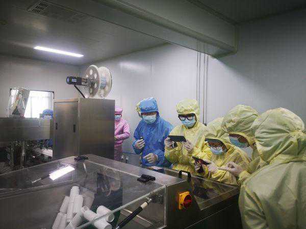 在工作人员带领下,直播小组体会了保健食品生产企业严谨的更衣步骤和对生产区域卫生环境的严谨管理。第一次更衣之后只能进入制水间、空调机房、仓库等一般区,想要进入洁净区还需要二次更衣。在二次更衣间,直播小组在企业工作人员指导下换专用工作鞋、更换口罩、换洁净服、戴手套、手部消毒。要求把上衣扎进裤子里,同时检查头发是否露在外面,避免头发等异物掉到产品中的情况。一番穿戴下来,大家只有眼睛露在外面。进入车间后,发现这里的操作工人也全部统一穿着标准,都是全副武装的样子。