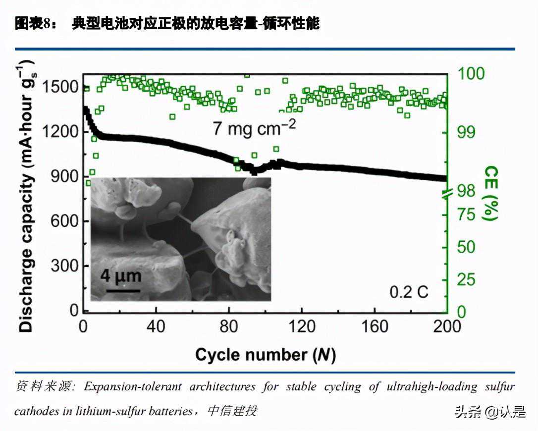 在报告《电池科技前瞻系列报告之三:高容量/活性物质载量硫系正极》中分析论文Expansion-tolerantarchitecturesforstablecyclingofultrahigh-loadingsulfurcathodesinlithium-sulfurbatteries里研究者制备的,对体积膨胀具有高容忍度、循环寿命相对很高的硫系正极材料。