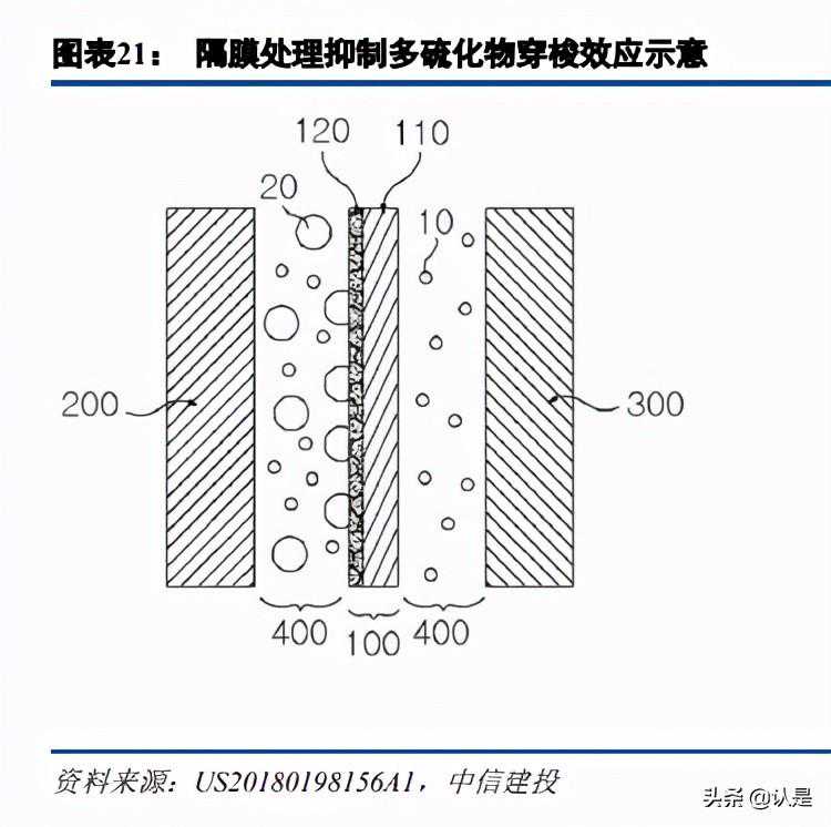 申请于2017年,公开于2018年的专利描述了在隔膜表面涂覆特殊涂层,使得多硫化物扩散通过隔膜的行为受到抑制,从而抑制“穿梭效应”的方法。该涂层为聚多巴胺及导电添加剂,隔膜基体是聚丙烯。专利显示,在0.1C/0.1C充放倍率条件下,30次循环内隔膜处理组体现出了更高的容量,且容量保持稳定。进一步的工作除聚多巴胺外还增加了聚丙烯酸锂层,样品循环寿命延长至160次。