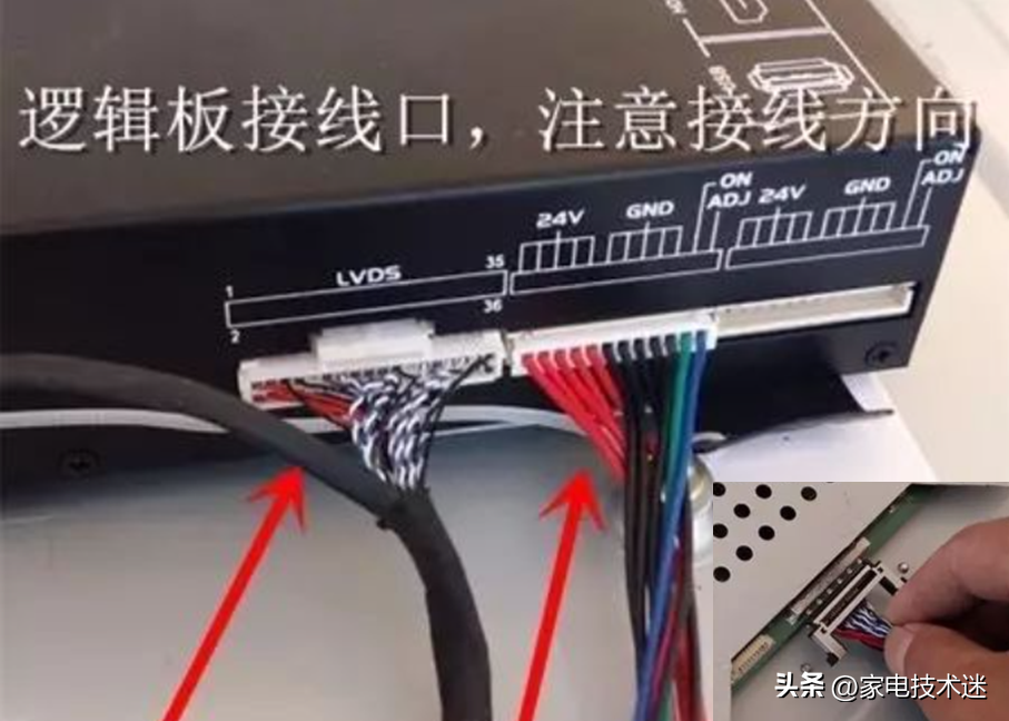 5、逻辑板接线,须按接线方向连接;在布线时要注意,将电源线和信号线区分开来,避免产生干扰;