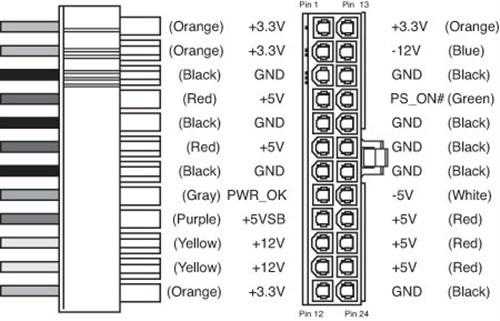 具体来说,黄色代表+12V电源线,红色代表+5V电源线,橙色代表+3.3V电源线,灰色代表信号线,蓝色代表-12V电源线,紫色代表+5VStandBy电源线,白色代表-5V电源线,绿色代表PS-ON信号线,黑色代表地线。