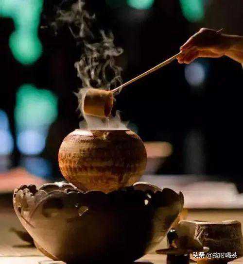 第二沸的时候,舀一瓢出来,用竹荚在沸水中做环形旋绕,用茶筴(《茶经》四之器中提到)把茶末从沸水中心倒下。