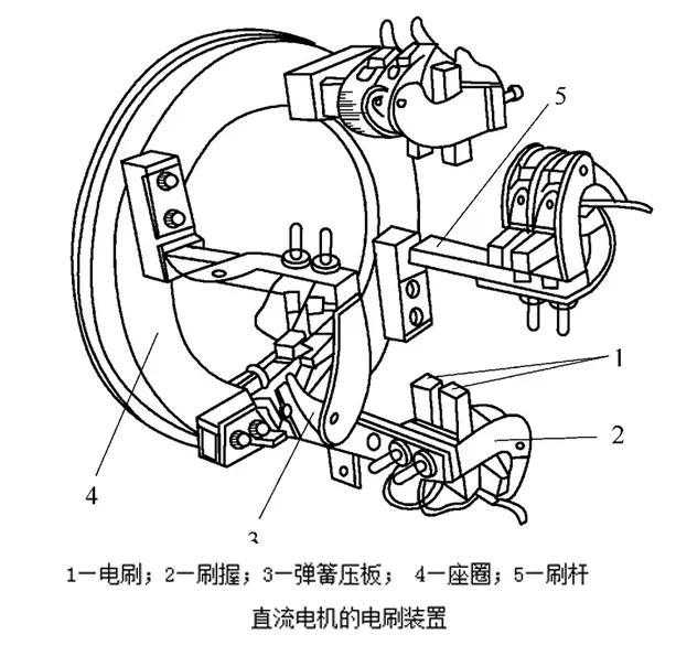 电刷装置:电刷装置是电枢电路的引出(或引入)装置,它由电刷、刷握、刷杆和连线等部分组成,如图所示,电刷是石墨或金属石墨组成的导电块,放在刷握内用弹簧以一定的压力按放在换向器的表面,旋转时与换向器表面形成滑动接触。刷握用螺钉夹紧在刷杆上。每一刷杆上的一排电刷组成一个电刷组,同极性的各刷杆用连线连在一起,再引到出线盒。刷杆装在可移动的刷杆座上,以便调整电刷的位置。