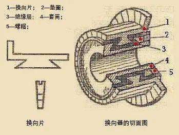 换向器:换向器是直流电机的关键部件之一,换向器由许多具有鸽尾行的换向片排成一个圆筒,其间用云母片绝缘,两端再用两个V形环夹紧二构成,如图3-10所示。每个电枢线圈首端与尾端的引线,分别焊入相应换向片的升高片内。小型电机常用塑料换向器,这种换向器用换向片排成圆筒,再用塑料通过热压制成。