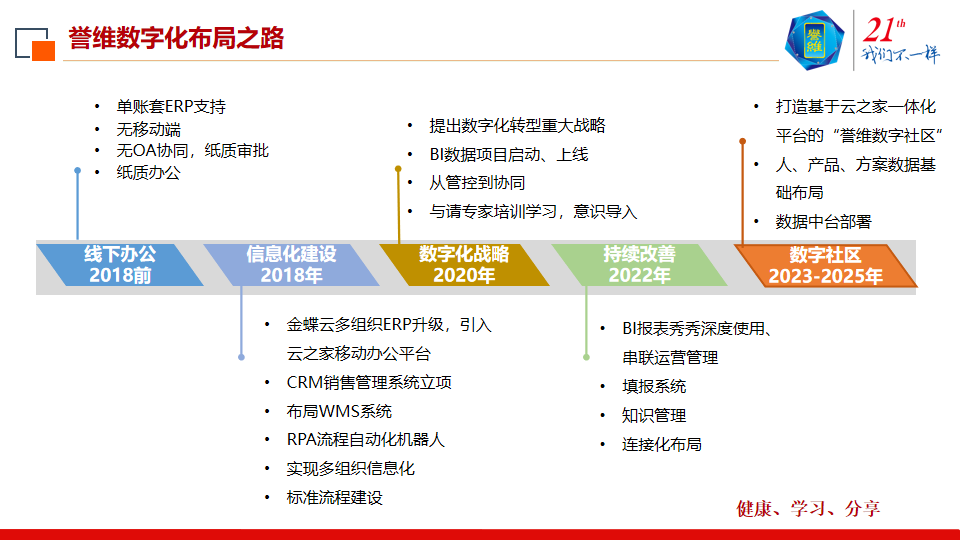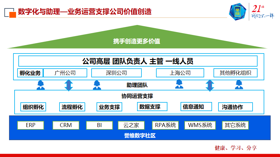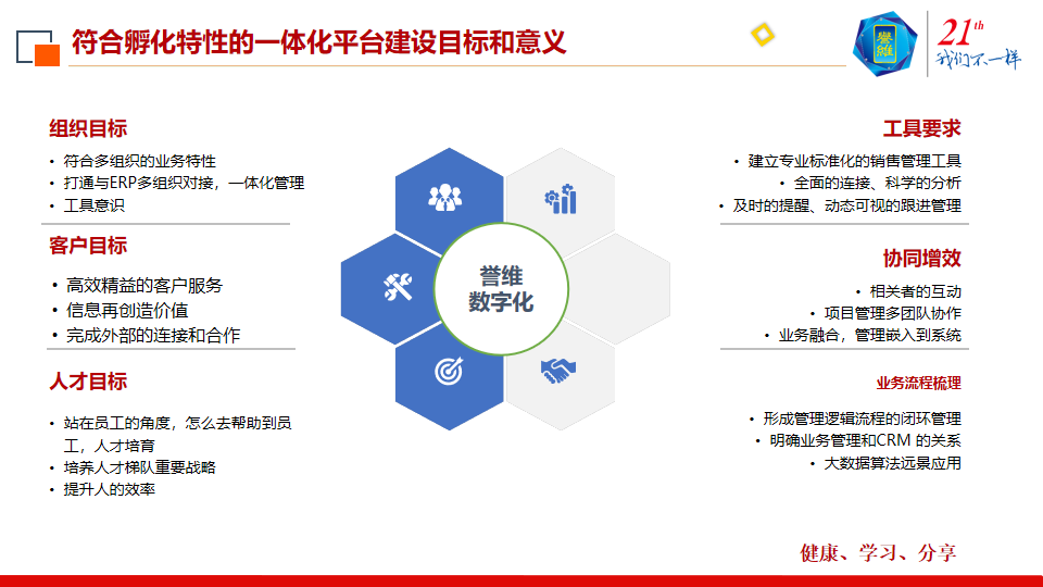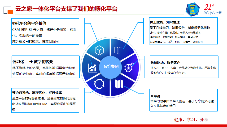 最后是文化赋能,用文化支撑,禀承誉维人的故事由誉维人来创造,所以在一体化平台上成立了誉维说的内刊,分享誉维的故事,组成誉维的企业文化。