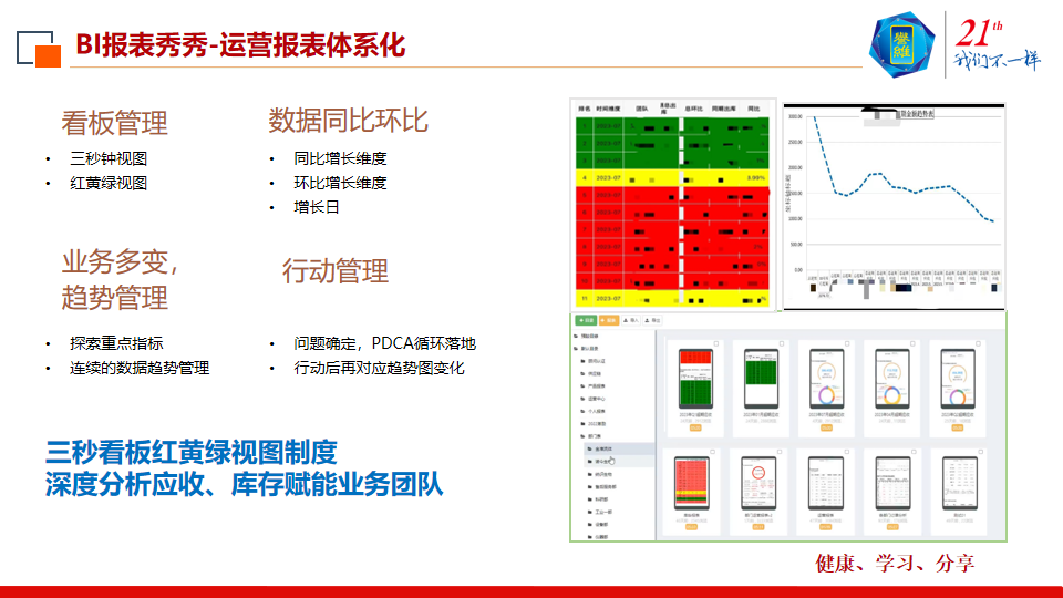 第二,用红、黄、绿,表示个人健康状况,绿色代表健康,黄色就是预警,红色处于警告状态。数据的同比、环比增长情况,可以体现新业务的成长情况。
