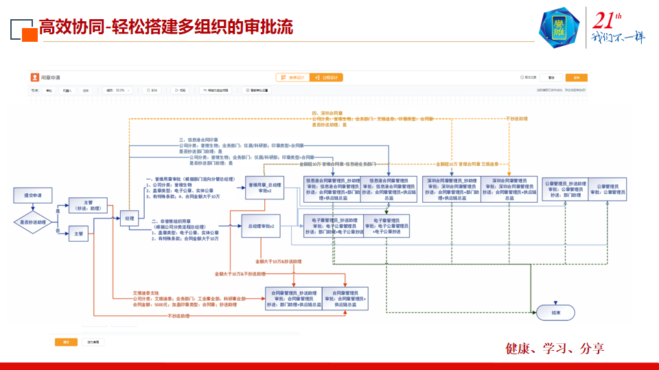 通过审批流,可以实现所有组织相互之间的交互,可以实现不同层级、不同需求之间的交叉管理;在一个页面上面能够实现多组织,高效协同,容易复制。