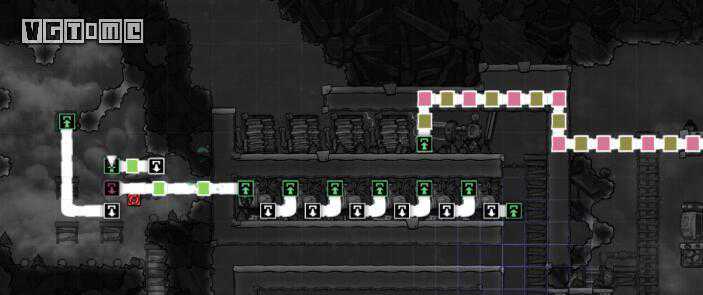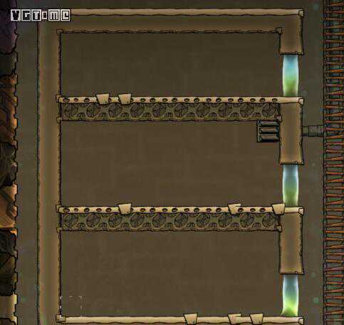 直角型液氯水门。上层两个方格都是水,上方可以是有氧环境,水平方向要求无氧,有氧侧要求2层高的墙,不能装梯子。其他要求与2类似,依靠复制人爬墙避免呼吸对水门的破坏。体积较小,需要翻一次墙,如果真空区需要确保绝对密闭,这个是不错的选择。