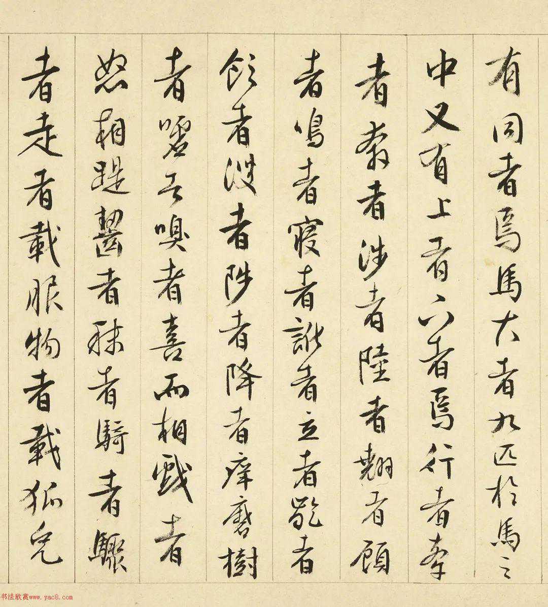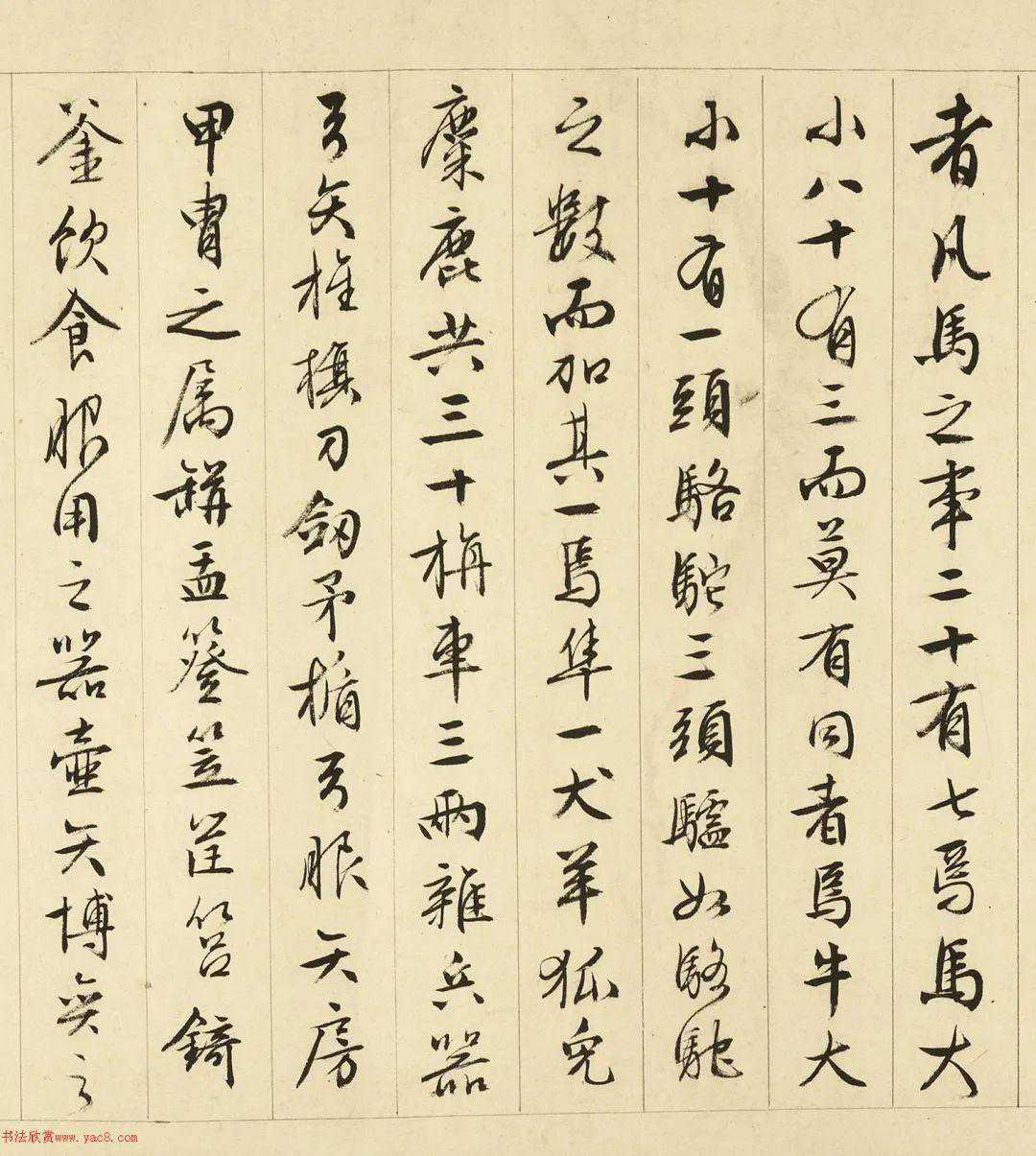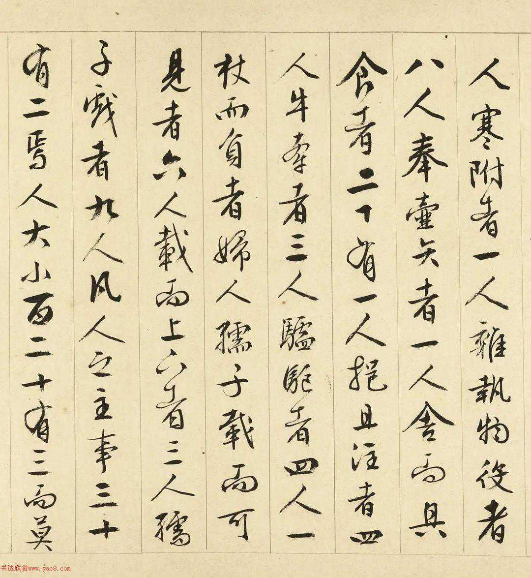 畫記。雜古今人物小畫共一卷。騎而立者五人。騎而被甲載兵者十人。一人騎執大旗前立。騎而被甲載兵者(點去)行且下牽者十人。騎且負者二人。騎執器者二人。騎擁田犬者一人。騎而牽者二人。騎而驅者三人。執羈靮者二人。騎而下倚馬臂隼而立者一人。騎而驅者二人。徒而驅牧者二人。坐而指使者一人。甲冑手弓矢鈇鉞植者七人。甲冑執幟植者十人。負者七人。偃寢休者二人。甲冑坐睡者一人。方涉者一人。方涉坐而脫足者一人。寒附者一人。雜執物役者八人。奉壺矢者一人。舍而具食者二十有一人。挹且注者四人。牛牽者三人。驢驅者四人。一杖而負者。婦人孺子載而可見者六人。載而上下者三人。孺子戲者九人。凡人之主事三十有二焉。人大小百二十有三而莫有同者焉。馬大者九匹。於馬之中又有上者下者焉。行者牽者。奔者涉者。陸者翹者。顧者鳴者。寢者訛者。立者齕者。飲者溲者。陟者降者。痒磨樹者。噓者嗅者。喜而相戲者。怒相踶齧者。秣者騎者。驟者走者。載服物者。載狐兔者。凡馬之事二十有七焉。馬大小八十有三而莫有同者焉。牛大小十一頭。駱駝三頭。驢如駱駝之數。而加其一焉。隼一。犬羊狐兔麋鹿共三十。旃車三兩。雜兵器弓矢旌旗刀劍矛楯弓服矢房甲冑之屬。缾盂簦笠筐筥錡釜飲食服用之器。壺矢博奕之具。二百五十有一。皆曲極其妙。貞元甲戌年。余在京師甚無事。同居有獨孤生申叔者。始得此畫。而與余彈?。余勝而獲焉。意甚惜之。以為非一工人之所能運思。蓋藂集眾工人之所長耳。雖百金不願易也。明年出京師至河陽。與二三客論品格。因出而觀之。座有趙侍御者。君子人也。見之蹙然若有感。少而進曰。噫。余手之摹也。亡之且二十年。余少常有志乎茲事。得國本。絕人事而摹得之。遊閩中而喪焉。居閒處獨時。往日來余懷也。以其始為之勞。而夙好之篤也。今雖遇之。力不能為已。且命工人存其大都焉。余既甚愛之。又感趙君之事。因以贈之。而記其人物之形狀與數。而時觀之以自釋焉。