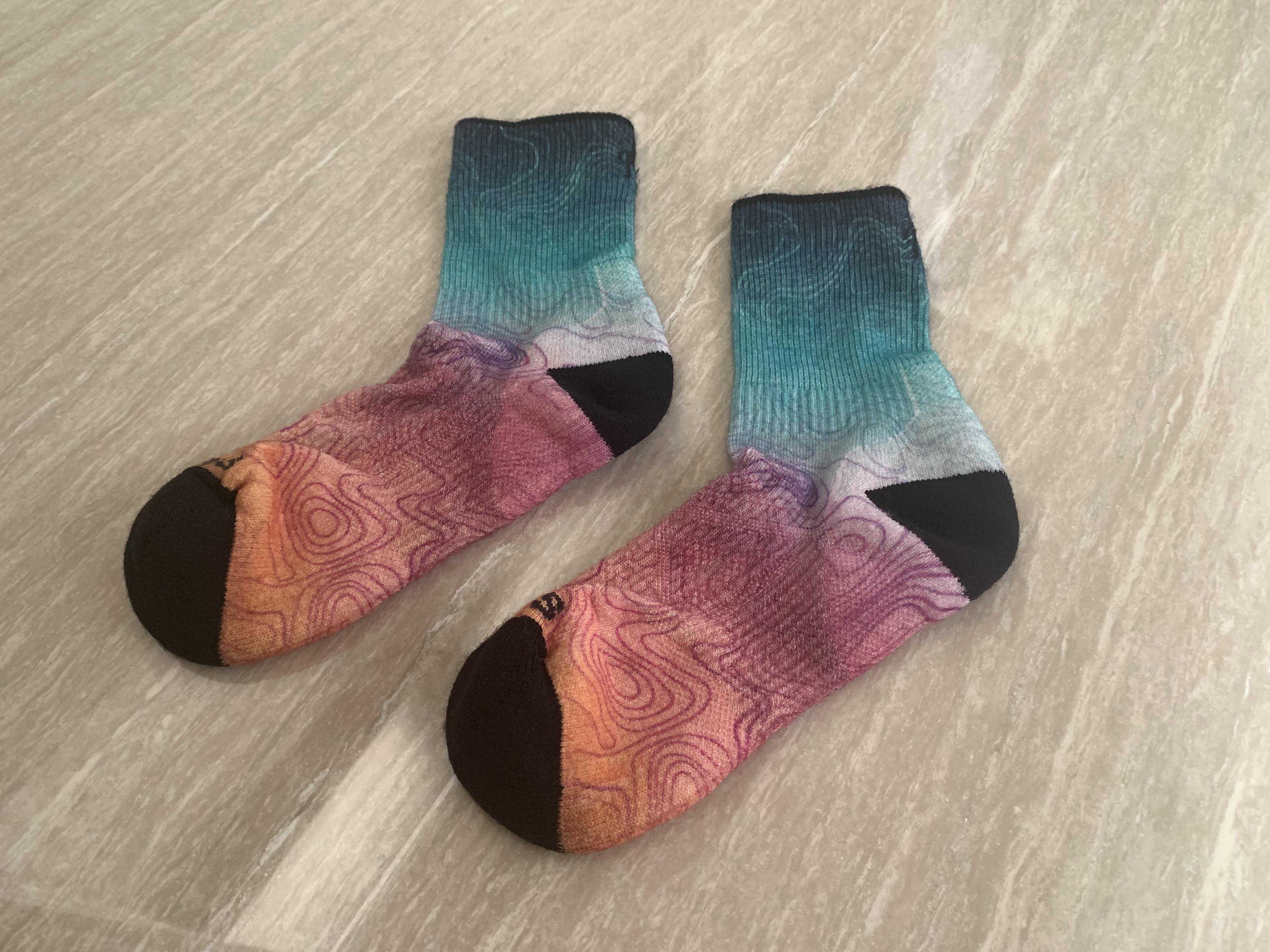 这次走负重约6公斤,在这双袜子定位的轻量避震范围内,走起来舒适无负担。原本有点担心毛巾底的接缝处会不会卡卡的很突兀,没想到完全无感!鞋子穿起来没有因为厚袜变很紧,小腿也没有被袜子勒住不舒服的感觉。