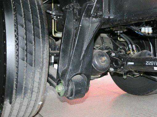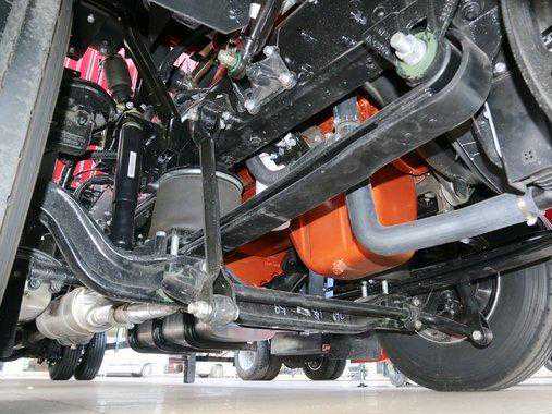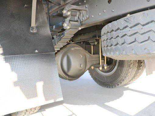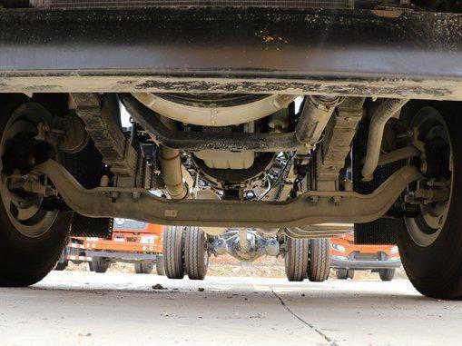 配备有六条型号为TR668的双喜轮胎,规格为10.00R20,这款轮胎主打良好的道路适应性、静音能力以及高耐磨能力,适用于中长途货车全轮位使用,有良好的多路况通过能力。底盘为前7后7+6钢板弹簧悬架结构,承载能力得到保障。车重7.905吨,可搭载长6750mm,宽2460mm仓栅式货箱。另外车配备了300L的钢制油箱,长途续航能力较弱。