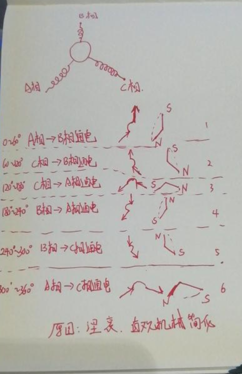 当转子位置如图1时,靠近N极的2/3号霍尔传感器会感应到,控制电路控制C相向B向通电,使C相为N极,B相为S极,从而吸引转子转动。