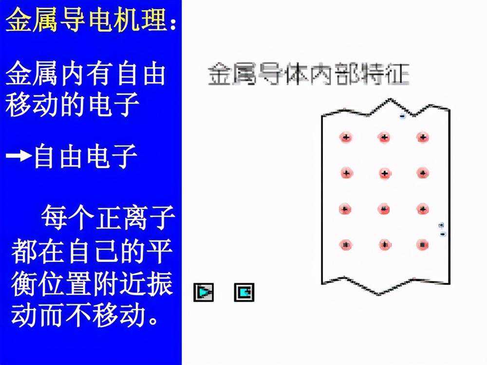 1.金属导电:导体中有大量自由电子,在电场力的作用下,自由电子受到与电场方向相反的电场力而产生加速运动,但同时又相互碰撞,及与处于热振动的阳离子或杂质原子碰撞,不断减速,这样动态平衡状态下,自由电子以平均速度定向运动,形成稳定的电流。