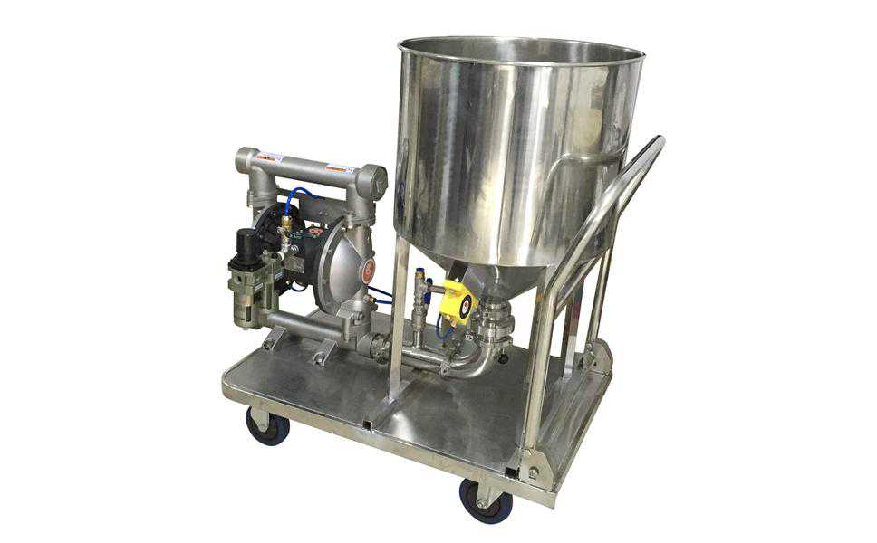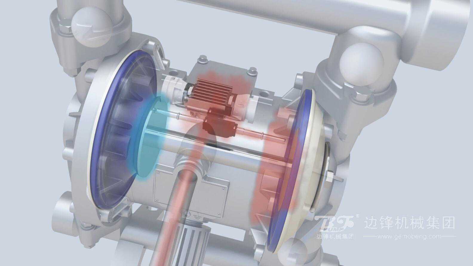 气动粉体输送泵是在气动隔膜泵基础上进行改进而诞生的新型粉体输送设备。其原理是:在泵的两个对称工作腔中,各装有弹性隔膜,连杆将两块隔膜结成一体,压缩空气从泵的进气接头进入中间体后,推动两个工作腔内的隔膜,驱动连杆联结的隔膜同步运动。与此同时,另一工作腔中的气体则从其隔膜的背面排出泵外。当活塞达到行程终点,配气阀则自动的将压缩空气引入另一工作腔,推动泵朝反向运动,这样就形成了两个隔膜的同步往复运动。每个工作腔中又设置两个单向球阀,隔膜的往复运动,造成工作腔内容积的改变,迫使两个单向球阀交替的开启和关闭,从而使粉体连续的吸入和输出。同时借助立柱两侧及进出料口的气流导管中的疏通气流,达到平稳输出避免堵塞的目的。