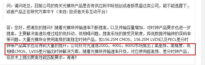 相关概念股中,泰晶科技是A股晶体振荡器的龙头个股之一,公司董秘在投资者互动平台表示,公司针对光模块从200G到800G不同规模的产品都做出了相应的布局,随着光模块未来传输速率的升级,公司也将给予相应的差分输出时钟解决方案。