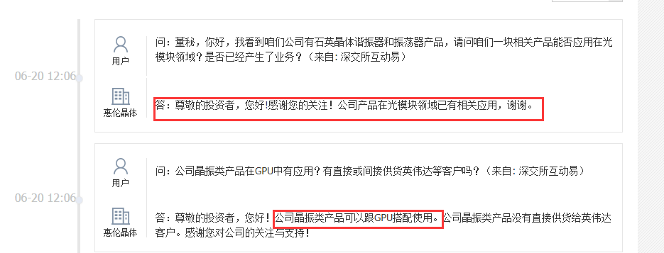 惠伦晶体也是董秘亲自下场“证明”。在6月20日的回答中,董秘表示,公司产品在光模块领域已有相关应用,其中特别是晶振类产品,可以和GPU搭配使用。尽管未直接供货给英伟达,但公司产品仍存在通过中间厂商供货给英伟达的可能性。