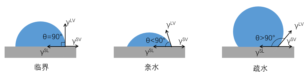 液滴在固体表面所形成的接触角是三种界面张力共同作用后平衡的结果,此时体系能量最小,液滴处于稳态。接触角与界面张力的关系可以通过杨氏方程(Young'sequation)表示。需要说明的是,这里的固体表面指的是光滑平整均匀的理想表面,而现实中固体表面的粗糙度和化学性质对固体的润湿性有很大影响,后来一些科学家在周期性微结构(Wenzel方程)和复合表面(Cassie-Baxter方程)的假设下也提出了类似的方程。