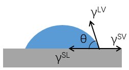 接触角指在气、液、固三相交点处所作的气—液界面的切线,穿过液体与固—液交界线之间的夹角。用θ表示,如下图所示。其中,上标S、L、V分别代表固相、液相和气相,三个箭头代表的是三种界面的界面张力。