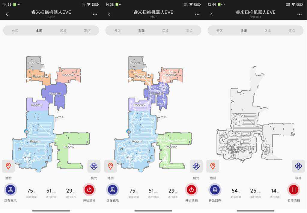 ▲主界面比较简单,只有开始回充,开始清扫,模式,区域,地图等几个菜单,由于第一次使用需要构建地图之后才能实现在地图上的操作。