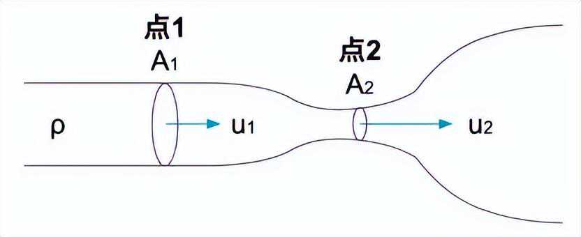 从连续性方程看,流速随着管道截面积的变化而变化。具体来说,管子粗的地方流速慢,管子细的地方流速快。因此,通过测量截面积不同的两个位置的压力,可以根据伯努利定理得出流速,Q=u1A1=u2A2。