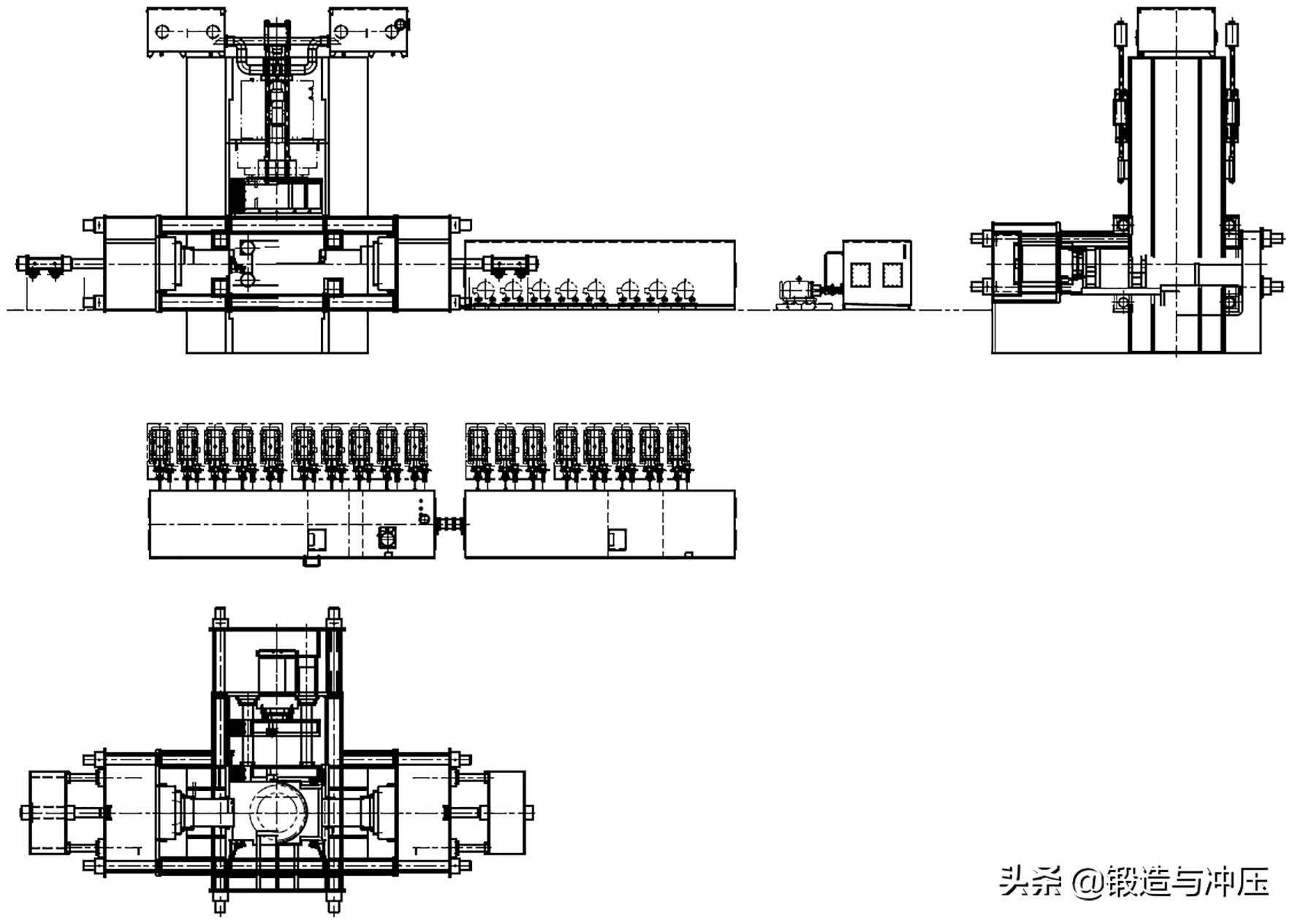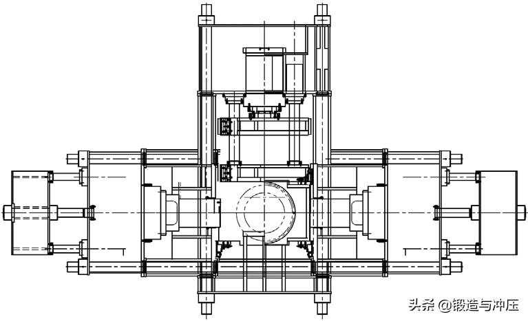 多向模锻技术是一种先进精密、节能省材的锻造技术,主要用于汽车、机械、石油化工、锅炉制造、航空航天、船舶等行业多面体结构件的一次成形,可显著提高零件强度,降低生产成本,促进零件轻量化。由于其技术及装备要求较高,至今只有少数国外公司掌握,并垄断着大型核电、航空航天、石油化工等多向模锻件的生产。本文介绍的多向模锻设备能一次锻造完成三通阀体整体结构,包括三向法兰、三向内孔,且不需要余料飞边,克服了现有技术的缺陷,有效提高原材料利用率20%以上,提高机械加工效率60%以上,还实现了金属全纤维锻造成形,提高了产品综合机械性能和质量。