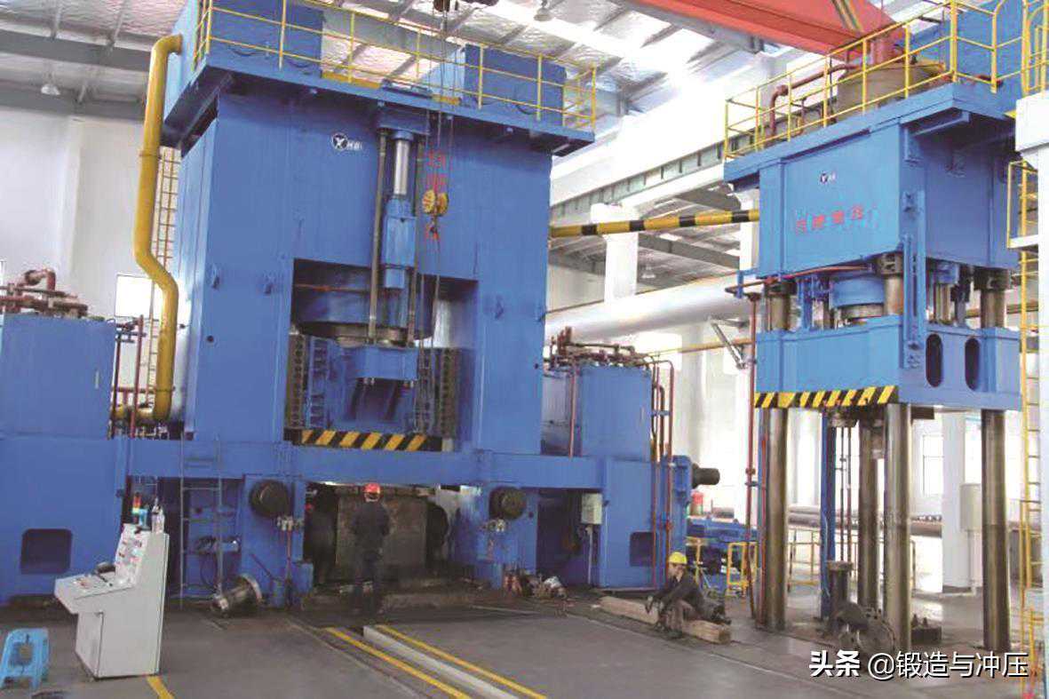 多向模锻液压机的主要方案多向模锻液压机采用三梁四柱框架结构机身,在水平方向后侧安装拉伸滑块和压边滑块,可在水平面四个方向(4轴)同时成形,其中后侧方向可实现双动压制;建立了精确的工艺缺陷预测计算模型,通过优化轴向推力的加载曲线和模锻坯料的形状、尺寸等工艺参数,改善成形质量,对典型模锻构件仿真模拟研究及工艺参数优化;采用图像检测技术构建在线检测系统,辅助形成挤压成形工艺系统,可实现多向模锻件柔性成形和实时修正;采用高性能PLC控制技术,开发了大型多向模锻液压机专用数控系统,能够实现多向模锻件的送料、取料和定位装置的控制,多向模锻件的冷却和润滑的控制,多向模锻件的挤压深度、挤压力和压边力的控制,液压伺服控制和多轴运动控制等;开发出的专用液压比例伺服系统可实现比例调压、变压力控制等;另外,该装备配备多向模锻件自动上下料及取料装置,有效地节省了人力成本。