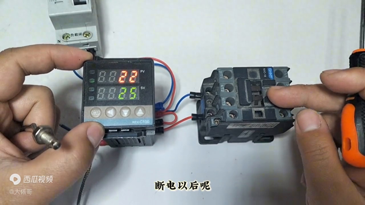 断电以后接触器上面接的是加热管,让加热管也停止加热。上面显示的红色的PV,这个温度是实际的温度。这个是温度传感器,现在给它捏住,给它加一下热,看一下实际温度在上升。到达温度以后接触器断电,接触器失电停止加热。