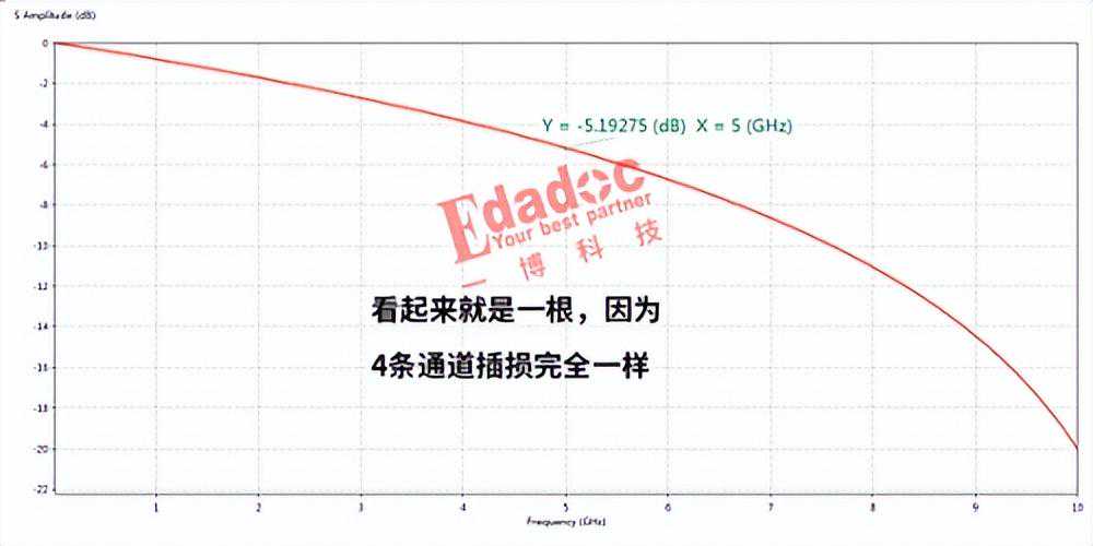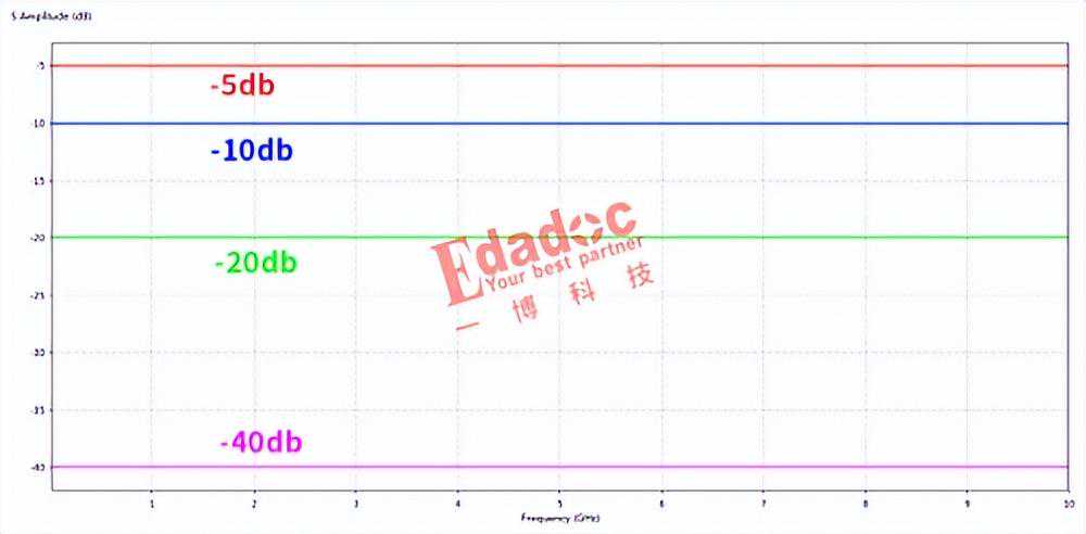 高速先生做出插损完全一样,但是回损分别是-40db(非常好),-20db(很好),-10db(很一般)和-5db(比较差)的四条通道S参数。分别如下所示:插损均为5db左右。