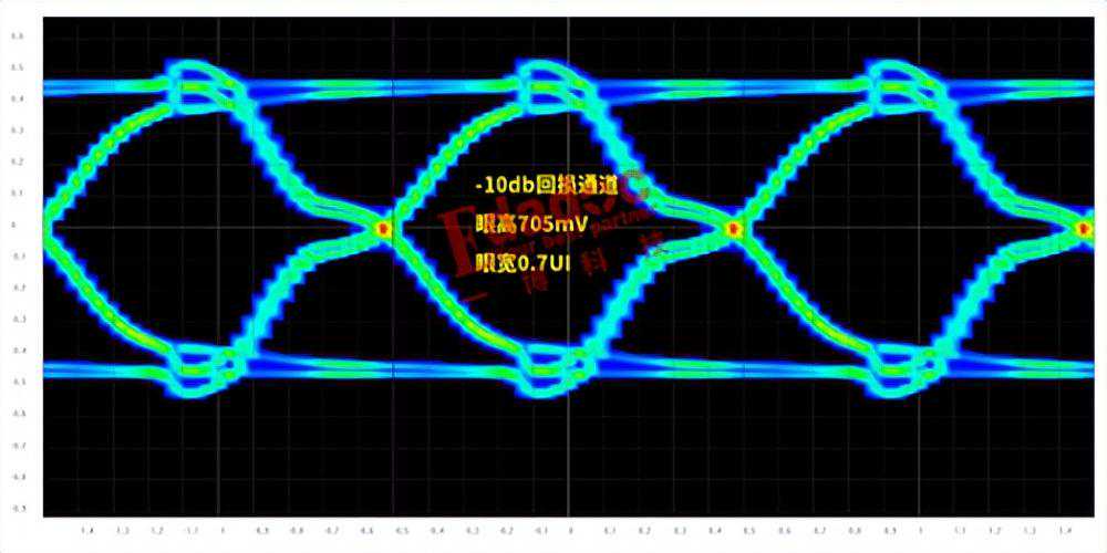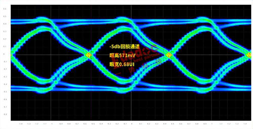 真不敢想象5db通道的眼图情况是怎么样的,那我们接着往下看吧,同样的码型经过-5db通道后结果如下,结果再从-10db回损的眼图中恶化了一大截,眼高只有不到600mV了。
