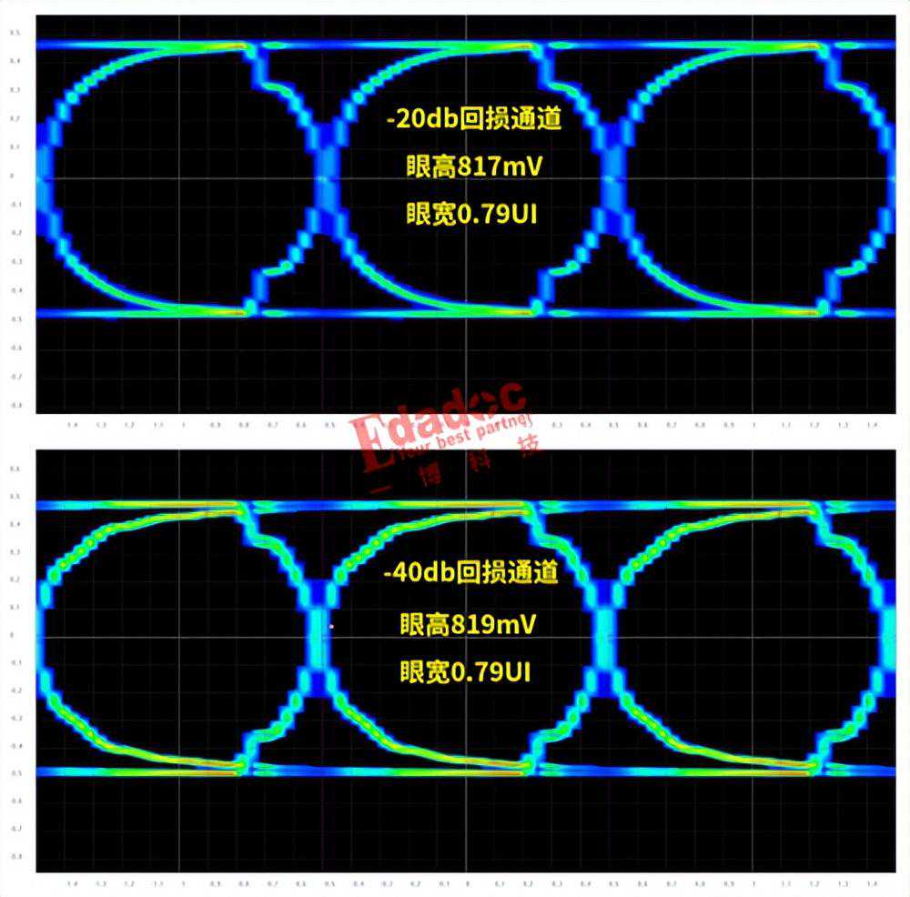 首先我们来比较大家都觉得最没悬念的-40db和-20db的两个通道,为什么说他们没悬念,因为别说-40db回损了,在很多高速无源协议中,-20db回损都是非常理想的指标啦!那我们就先看这两个通道的接收端情况,分别用上面sigrity软件仿真,对比结果如下: