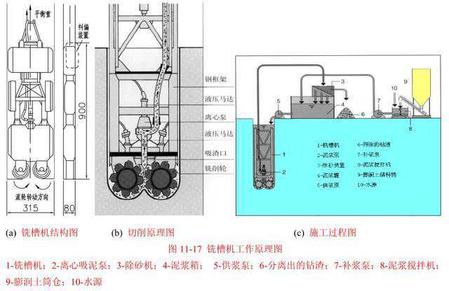 其工作原理是:以动力驱使安装在机架上的两个鼓轮(也称铣轮)向相互反向旋转来削掘岩(土)并破碎成小块,利用机架自身配置的泵吸反循环系统将钻掘出的土岩渣与泥浆混合物通过铣轮中间的吸砂口抽吸出排到地面专用除砂设备进行集中处理,将泥土和岩石碎块从泥浆中分离,净化后的泥浆重新抽回槽中循环使用,如此往复,直至终孔成槽。图11-17所示为液压双轮铣工作原理图。
