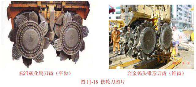 铣轮刀可根据不同地层相应选配,其形式主要有三类:标准炭化钨刀齿(平齿)、合金镶钨钢头的锥形刀齿(锥齿)和配滚动式钻头的轮状削掘齿(滚齿),分别适用于最大抗压强度为60MPa、140MPa及250MPa的岩石挖掘。