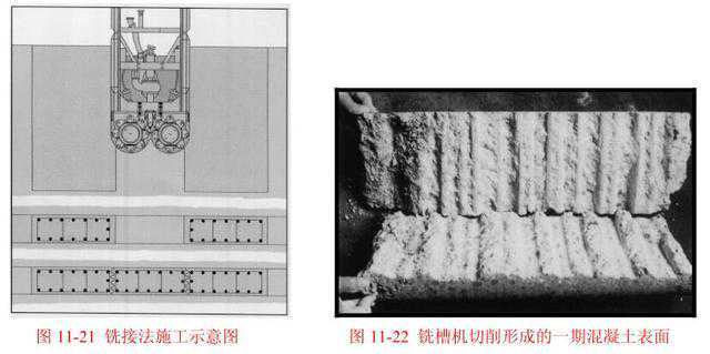 铣槽机成槽槽段之间的连接有一种比较有特色的方法,称为“铣接法”,如图11-21所示。即在进行一序槽段开挖时,超出槽段接缝中心线10cm~25cm,二序槽段开挖时,在两个一序槽段中间下入铣槽机,铣掉一序槽段超出部分的混凝土以形成锯齿形搭接,形成新鲜的混凝土接触面,然后浇筑二序槽混凝土。