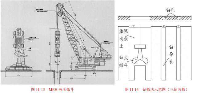 设备:钢丝绳抓斗—如意大利的土力(SOILMEC)和卡沙特兰地(Casagrande)公司、德国的宝峨(BAUER)、LEFFER和WIRTH公司、日本真砂(MASAGO)公司均生产各型的钢丝绳抓斗;液压导板抓斗—如德国宝峨(BAUER)公司生产的DHG和GB两种类型,日本真砂(MASAGO)公司生产的MHL和MEH(为超大型,最大闭斗力高达1725kN,可在砂卵石地基开挖深达150m和厚大3.0m的地下墙)型,利伯海尔公司生产的HSWG抓斗;导杆式抓斗—如法国的KELLY、意大利的KRC和日本的CON系列;混合式液压抓斗—如意大利土力(SOILMEC)公司的BH-7/12等和MAIT公司的HR160抓斗。