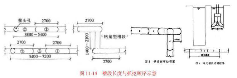 使用抓斗成槽,可以单抓成槽,也可以多抓成槽,槽段幅长一般为3.8~7.2m。单抓成槽,即一次抓取一个槽幅;多抓成槽,每个槽幅由三抓或多抓形成。通常单序抓的长度等于抓斗的最大开度(2.4m左右),双序抓的长度小于抓斗最大开度。