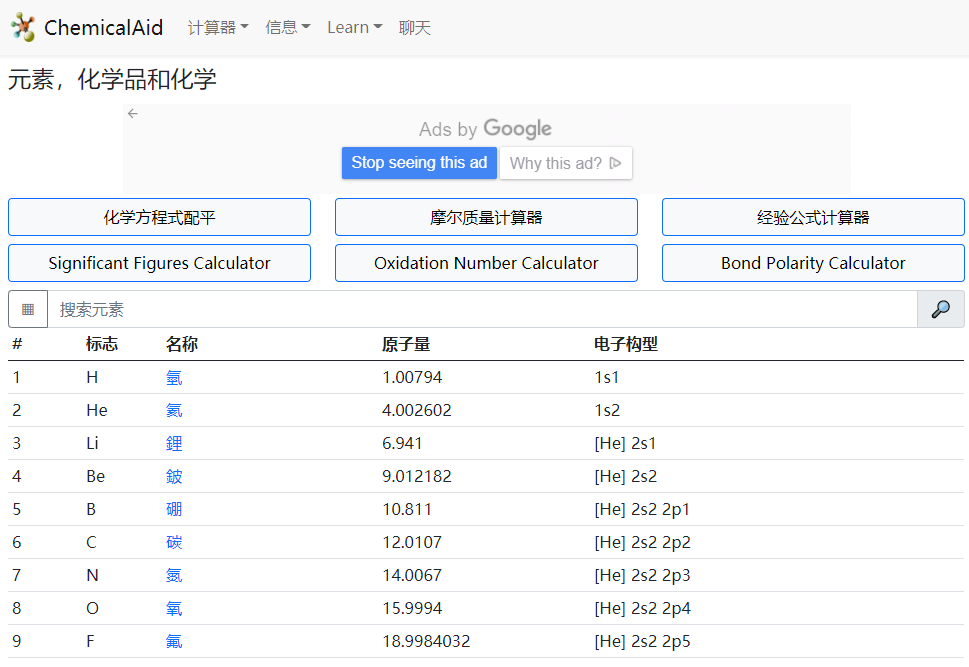 有趣的化学小知识网站,包含方程式配平、摩尔质量计算器和经验公式计算器等小工具。