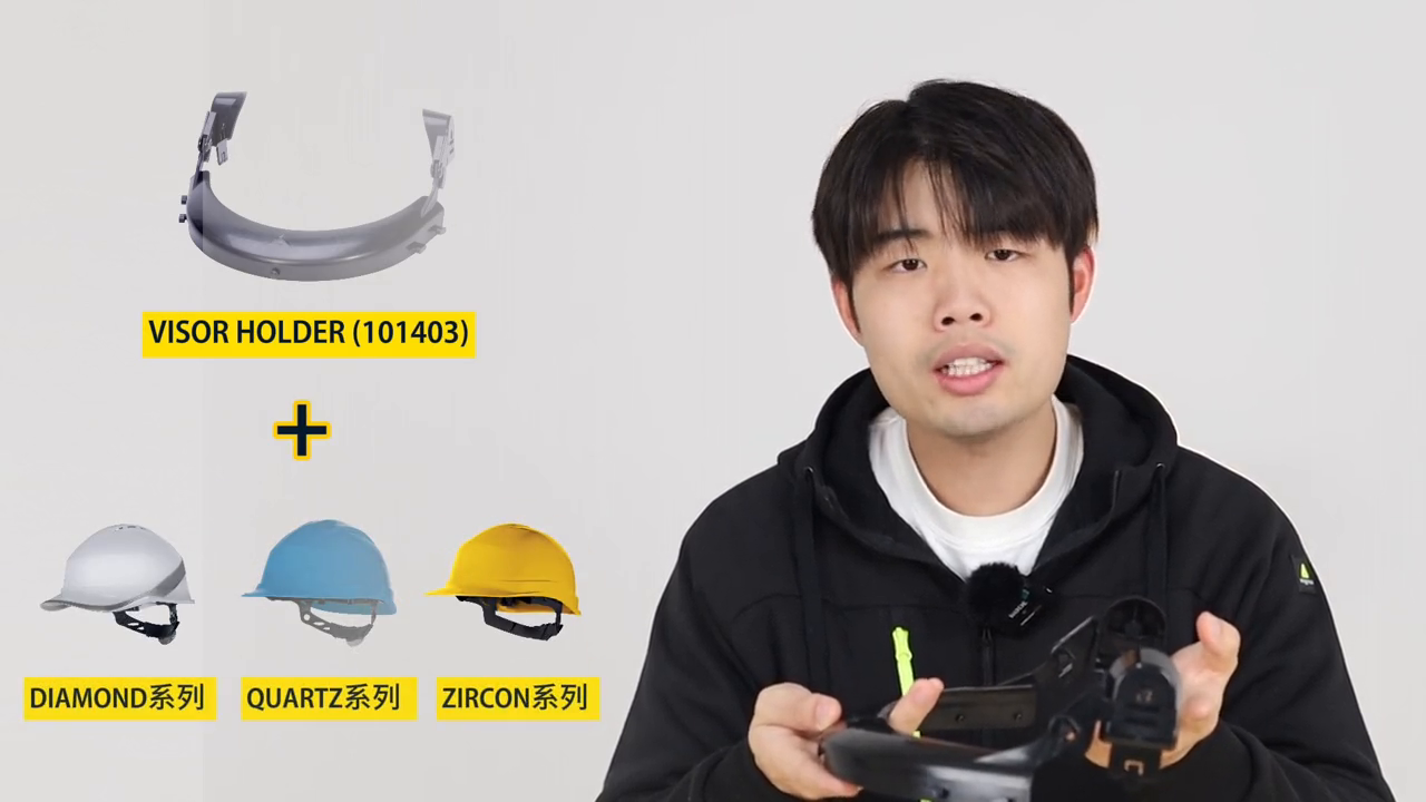 ·第二款支架101403为安全帽组合款,适用于代尔塔安全帽diamond、quats、ziko系列,更可叠加代尔塔插口式耳罩组合使用。这款支架与四款面屏均可组合佩戴。