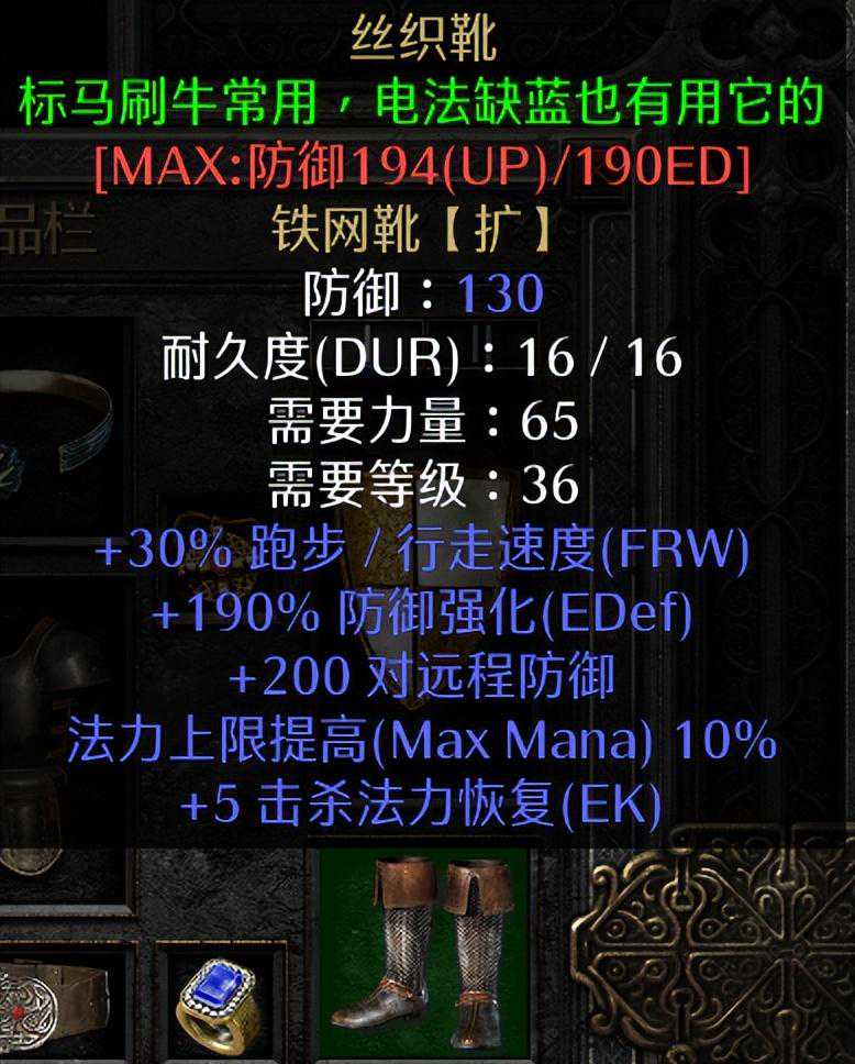 靴子的选择比较多,窃取法力不够的话可以选择纱织,有5点的击杀法力恢复和10%的法力上限,同样非常适用于刷牛场这种怪物密集的场景,另外水上漂也是一个不错的选择,有最多65点的生命加成和15点的敏捷,是走格挡流玩法的标配靴子,在战斗命令的加成下血量的加成非常可观,有条件的也可以用百抗靴来补充抗性,可以省下一些护身符的位置。