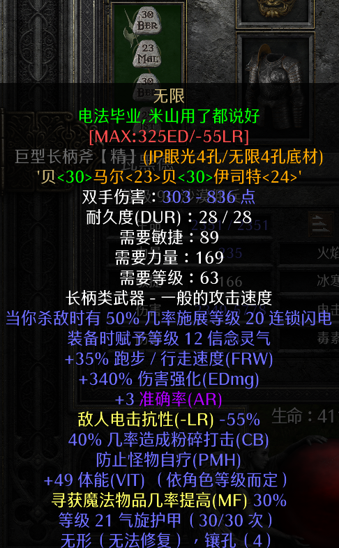 佣兵的话使用第二幕的枪兵,刷牛场的话也可以不带,佣兵会造成怪物分散影响效率,不过想刷其他地图还是要带上,佣兵的武器使用无限符文武器,附带的12级信念灵气可以破掉大部分电免怪的免疫,是标马刷其他场景的必备条件,另外无限还有很高的伤害强化和40%的粉碎性打击几率,对佣兵自身的输出能力提升也是非常大。