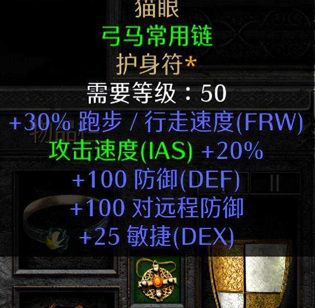 项链可以用大君之怒,有1点的技能加成和20%的攻速加成,对伤害效果的提升还是比较明显的,致命打击的话对标马来说用处不大,不过35%的电击抗性还是很不错的,也可以使用猫眼项链,相比大君之怒来说少了1点的技能加成和35%的电抗,但是有30%的高跑加成,对于追求刷图效率的标马来说很实用,还有25点的敏捷加成,也是可以解放更多的属性点去加到体力上边,喜欢用谜团飞图的也可以选择2点技能加成的快速施法项链,配合精神盾和风头只需要8%的快速施法就能达到13F的施法档位。