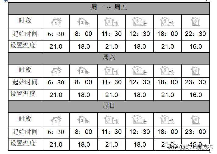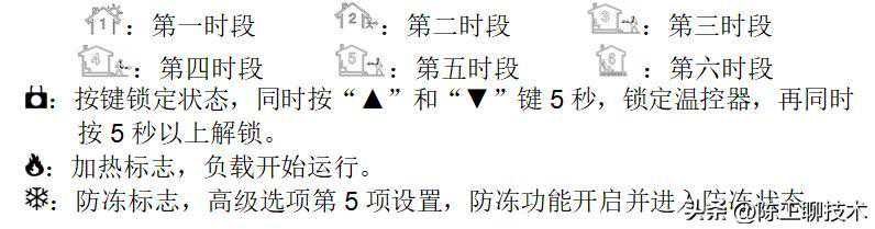 编程工作模式:温控器根据设置好的时段和温度自动运行,编程工作模式分四个时间段和对应的四个时段温度,各个时段图标说明如下。