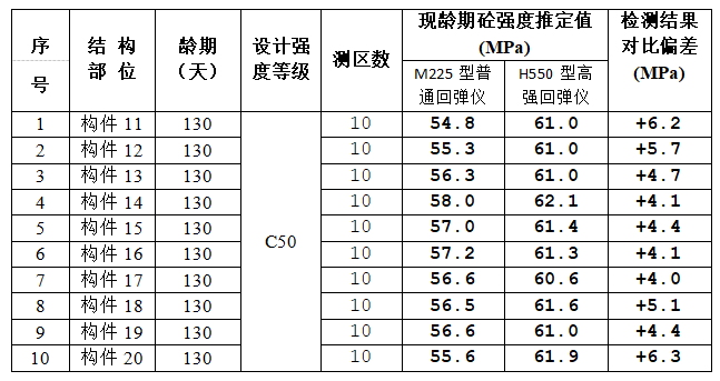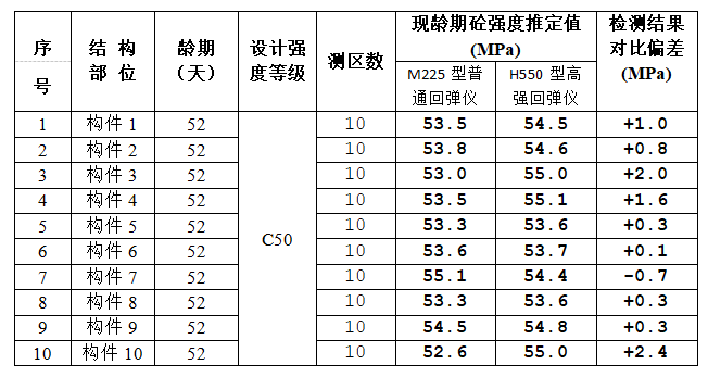 试验一:某工程设计强度为C50的剪力墙10堵,龄期52天,分别采用M225型普通回弹仪与H550型高强回弹仪按照标准规定进行检测,检测结果如下: