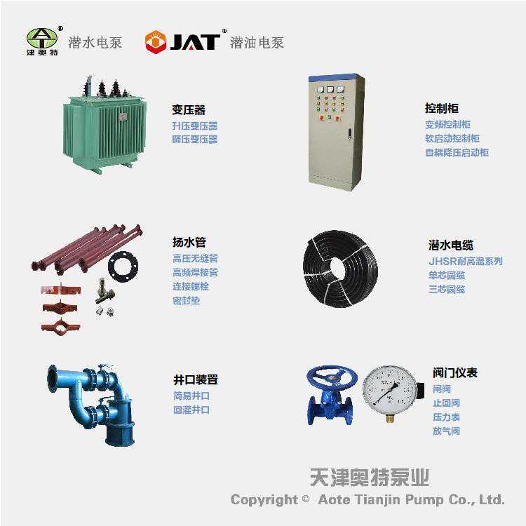 井用潜水泵整套系统包括水泵工作部件、电动机、扬水管、防水电缆、泵座、控制柜及相关附件部分。其中附件包括:电缆卡子、电缆护罩、电缆接线头、螺栓、扬水管结合部分密封垫等。