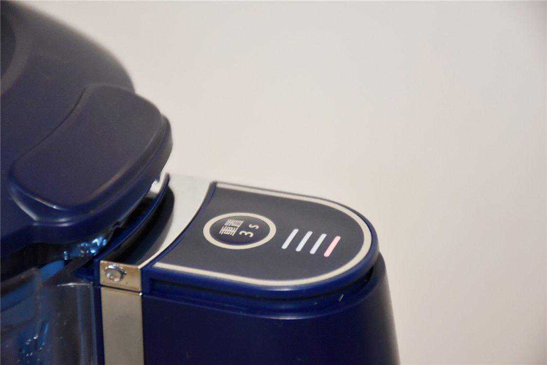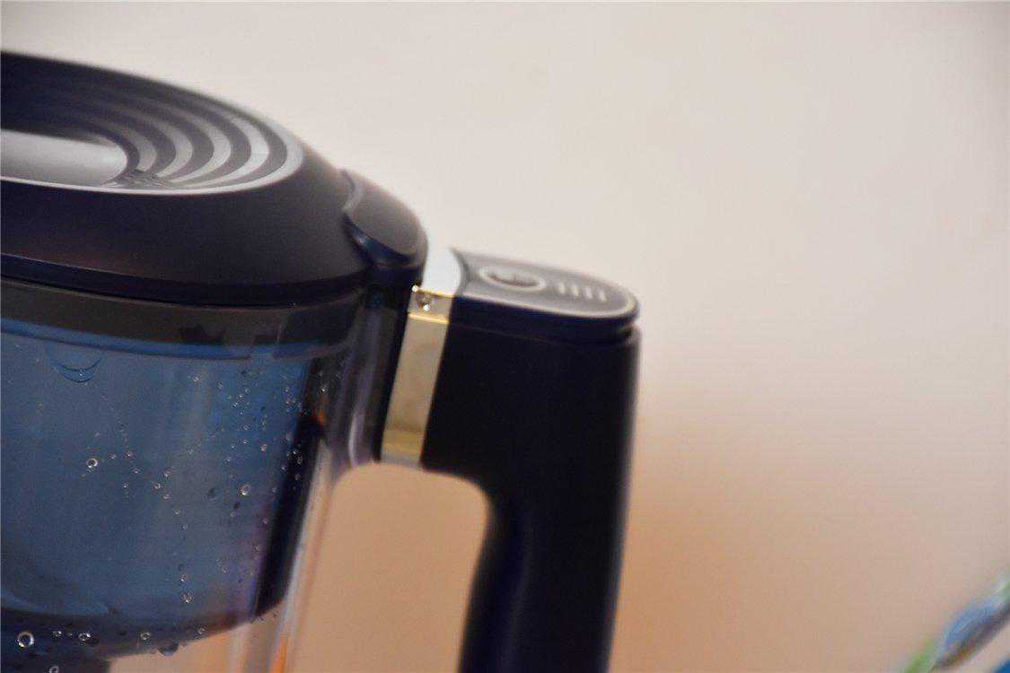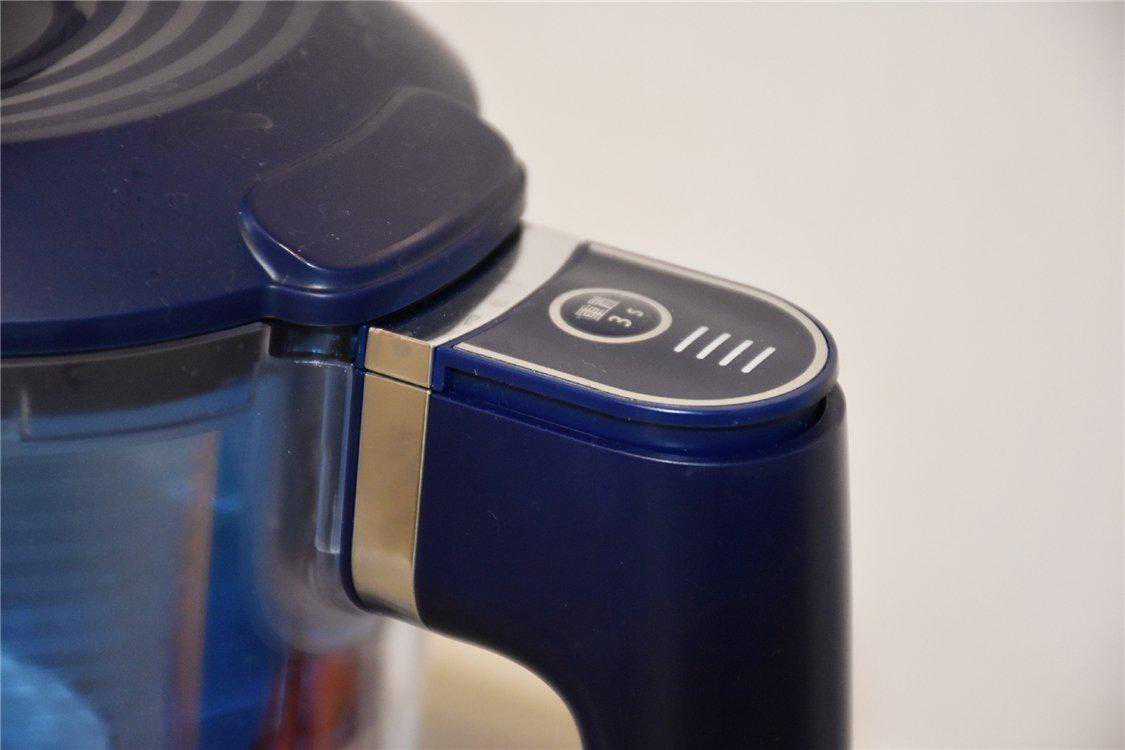 这款智能流量器根据滤水的水流量智能监测,并且实时统计,很精准地判断了滤芯的使用寿命,在手柄上方的位置,可以看到有四道杠,还有一个清零按钮,在开始使用水壶以后,激活计时器就可以看到亮起的四道杠,根据使用时间,四道杠会逐渐消失。