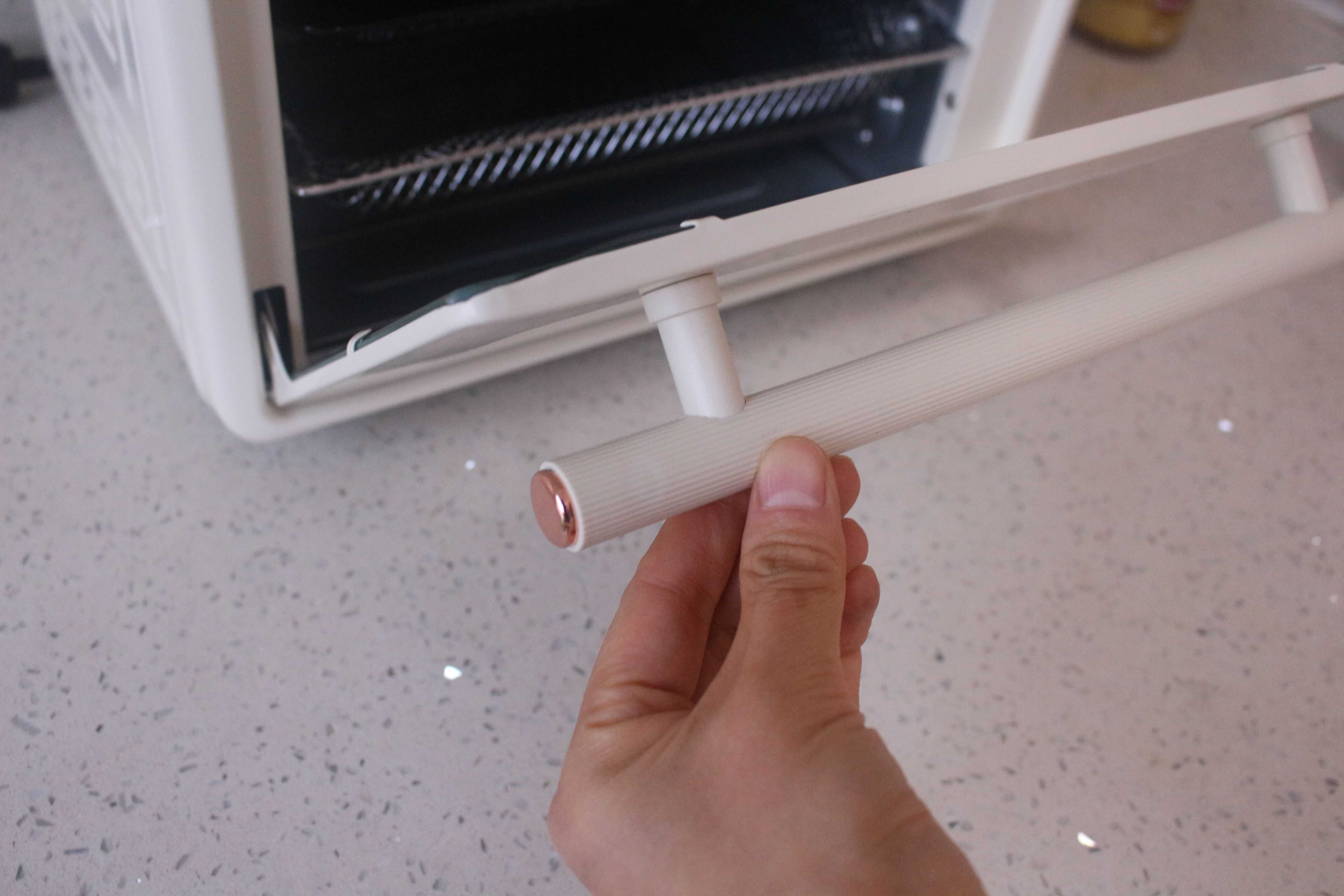 从左到右依次是功能旋钮、温度旋钮和时间旋钮。功能可以选择空气炸、烘焙、烧烤、干果、披萨,还可以做爆米花呢。烤箱的温度控制在80℃-230℃,80℃平时可以用来解冻一些冷冻的食品,平时烤蒜香排骨的时候,选择230℃,出箱时,满屋子都是排骨的香味,入口的时候,并没有很多的油脂,紧锁肉汁。