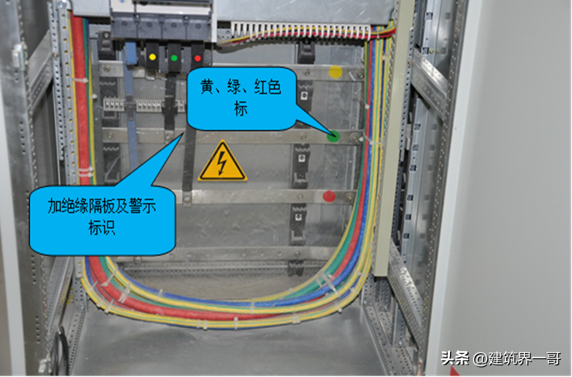 配电柜内标识:配电柜接线铜排,必须张贴黄、绿、红、蓝色标及警示标识;配电柜接线铜排,必须安装安全隔栅板;分相电缆要套热缩管,不能裸露铜导线