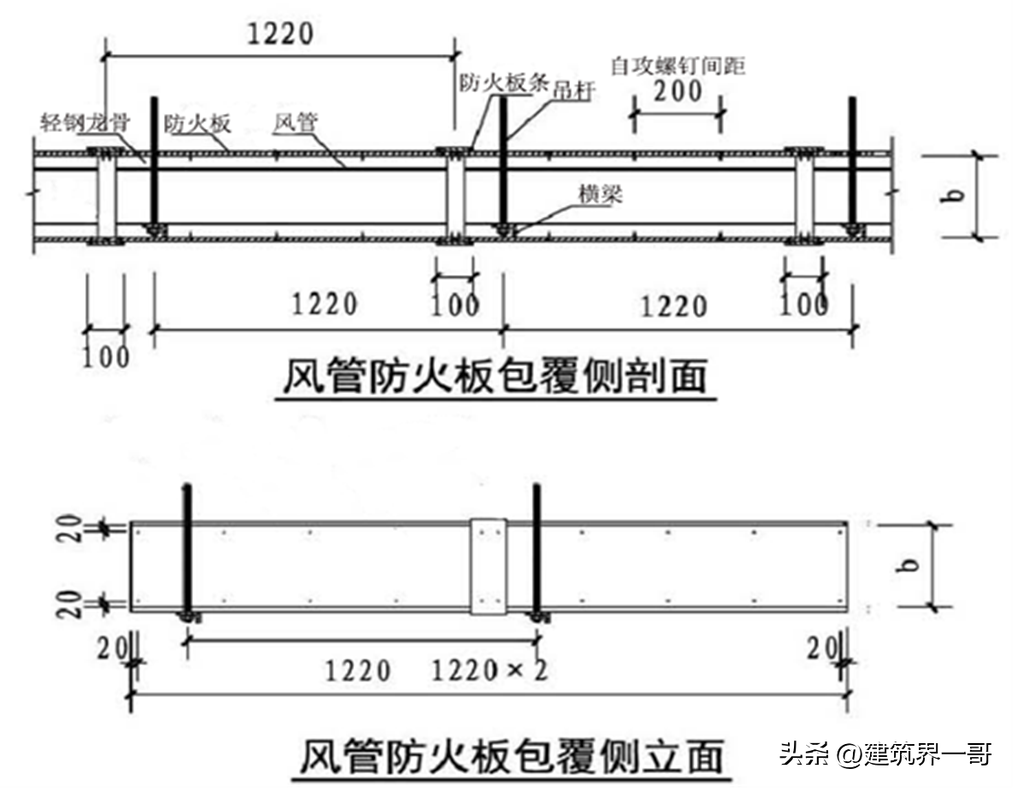 风管穿过防火隔墙、楼板、防火墙时,风管上防火阀两侧各2米的范围需要包覆纤维增强硅酸盐防火板,采用密度50kg/m3,厚度50mm的复合硅酸镁板高强度防潮、防火双层加肋铝箔,厚度为0.5mm;外包9mm厚纤维增强硅酸盐防火板